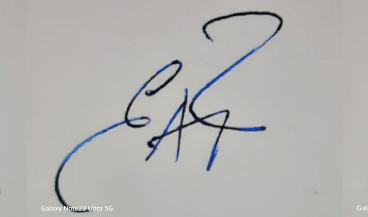 Fotografia ampliada de uma rubrica em 2D executada com caneta esferográfica cor azul.